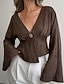 Damen Sommerhemd Freizeithemd Bluse Gerafft Knöpfe Asymmetrischer Saum Einfarbig Einfach Elegant Stilvoll Lässig Langarm Glockenärmel V Ausschnitt Crop Tops Täglich Ferien Ausgehen Braun Frühling