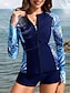 Damen Badeanzug Tankini Zweiteilig Shorts Bademode Reißverschluss Bauchkontrolle Hohe Taille Schlank Urlaub Strandbekleidung Blumen Rundhals Ärmellos Langarm Badeanzüge