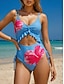 Damen Badeanzug Einteiler Monokini Bademode Bauchkontrolle Hohe Taille Schlank Rückenfrei Urlaub Strandbekleidung Blumen V Ausschnitt Ärmellos Badeanzüge