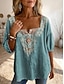 Damen Baumwoll-Leinen Bluse Floral Stylisch Lässig 3/4 Länge Ärmel Rundhals Reguläre Oberteile Täglich Bestickt Blau Schwarz Pink Grün Sommer Frühling