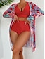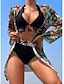 3-teiliger Damenbikini Badeanzug Shorts Slim Rückfrei Urlaub Strandbekleidung Blumengrafik V-Ausschnitt Ärmellos Langarm Badeanzüge