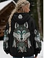 Damen-Kapuzenpullover mit Wikingermotiv, Tiergrafik, Vintage-Stil, Boho-Look, Langarm, Kapuze, normale Passform, Streetwear-Stil, Patchwork-Print, Vordertasche, Schwarz, Winter