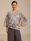 Damen Chiffon Tops Schnürung Blumen Elegant Dreiviertelarm Glockenärmel Rundhalsausschnitt Täglich Hochzeitsgast Hellgrau Sommer Frühling Herbst